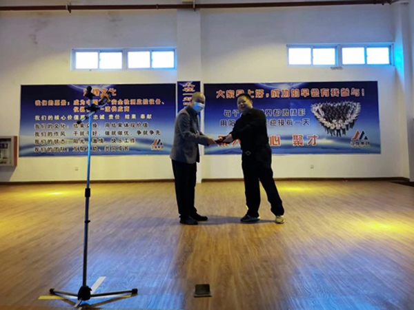李臣华董事长为2022年第一季度“江煤好人奖”得主韩迪颁发奖牌。