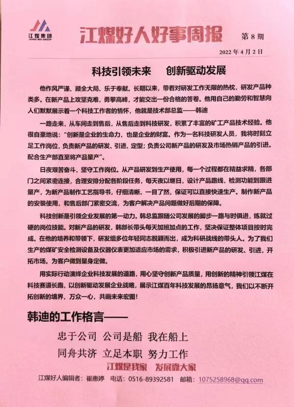 徐州江煤科技有限公司自2022年初开展“江煤科技好人好事周报”主题创建活动以来,江煤家人积极参与,内提素质,外树形象,营造出学习榜样、看齐榜样、争做榜样的浓厚氛围;增强了企业凝聚力、工作的执行力、责任心,提升了自身的价值。公司并于每季度末评选出“季度江煤好人奖”给予奖励。