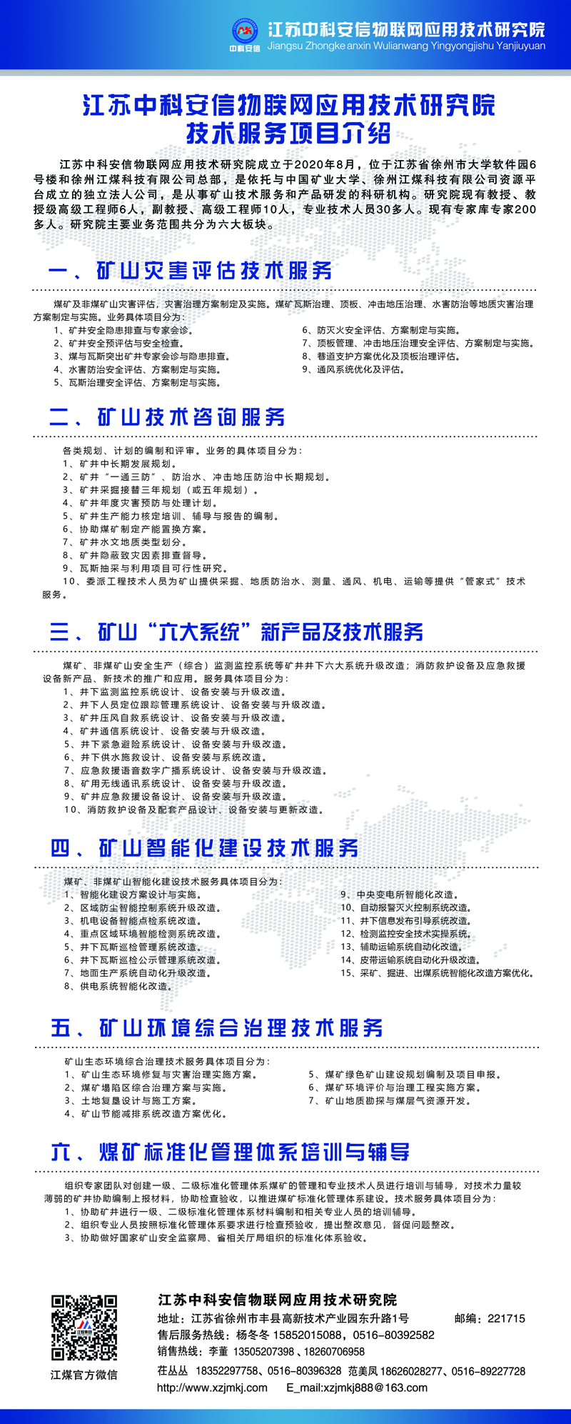 江苏中科安信物联网应用技术研究院成立于2020年8月,位于江苏省徐州市大学软件园6号楼和徐州江煤科技有限公司总部,是依托与中国矿业大学、徐州江煤科技有限公司资源平台成立的独立法人公司,是从事矿山技术服务和产品研发的科研机构。研究院现有教授、教授级高级工程师6人,副教授、高级工程师10人,专业技术人员30多人。现有专家库专家200多人。研究院主要业务范围共分为六大板块。