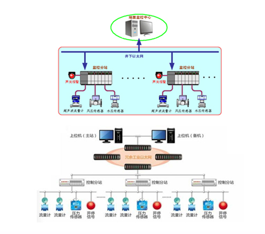 一、概述: 井下供风和供水系统是煤矿不可缺少的重要组成部分,也是六大系统必不可少的,在维护煤矿安全生产中起着十分重要的作用。我国煤矿井下供风、供水管路(以下简称风水管路)多数为建矿期间敷设安装。由于井下自然条件恶劣,管路长期受淋水侵蚀、巷道变形、矿井采动压等影响而出现跑冒滴漏,造成采煤工作面、掘进迎头因管路断裂或风、水压力不足影响生产的情况时有发生。浪费了宝贵资源,影响了矿井正常生产,给企业造成了较大的经济损失。 对于井下风水管路的运行使用情况,目前我国煤矿只采取人工巡查的方法进行检查,这样做有很多弊端:①效率低,耗费大量的人力、物力;②不能实时监测风、水管路的供风、供水情况,出现突发事件难以及时发现;③检查人员容易发生漏查。为最大限度地降低因风、水压力不足对采掘工作面生产的影响,根据我国煤矿的实际情况,我公司研制开发了一套能够做到动态监测、实时显示、欠压报警、迅速判断故障的管路检测系统。 二、系统结构: 在井下安装多台监测分站,每台分站连接超声波流量计、水压传感器、风压传感器等。监测分站处于24小时自动监测状态,实时动态监测风、水管路内输送介质的压力、流量等数据,监测分站可就地显示各参数,并具有超限报警功能。每台监测分站都配有单独的以太网接口,所有监测数据可通过井下以太网实时传输到地面监测上位机。 三、系统功能: 1、显示功能:在地面集控室工控机显示各压风管路压力、各供水管路流量。设有各设备的故障信号显示,并产生报警,提示值班人员采取有关措施; 四、主要技术指标: 1、水管流量测量流速范围:(0.01~12)m/s,误差±1.5%; 2、水管压力测量范围:(0~10)MPa,误差±2%;