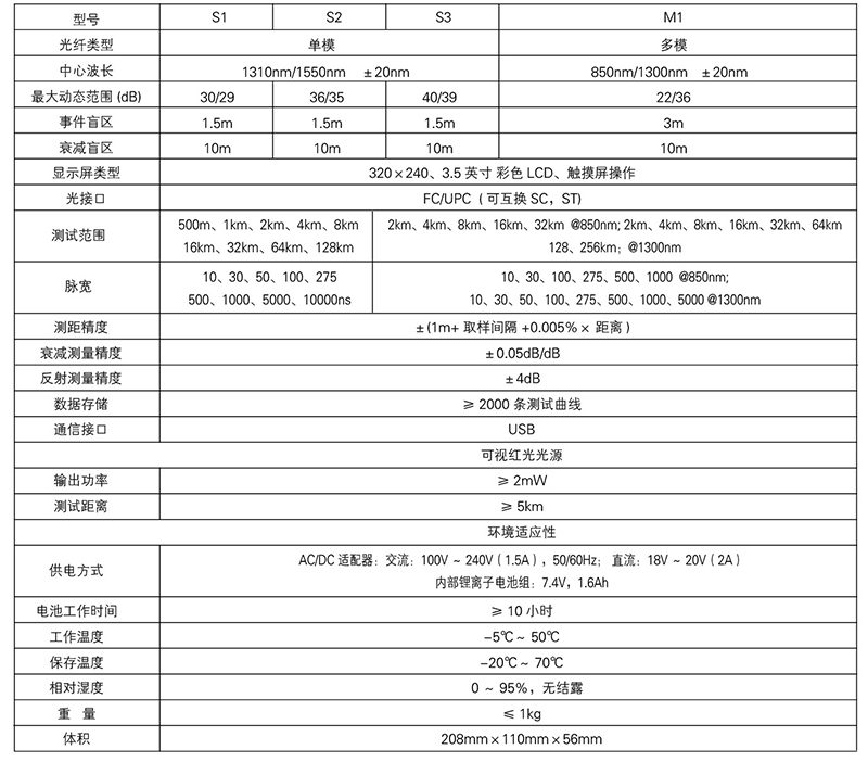 一、概述: 该产品是我司针对光纤通信系统测试而设计的新一代、智能化光纤测量仪器。本产品主要用于测量各类光纤、光缆的长度、损耗、接续质量等参数;能够迅速对光纤链路中的事件点、故障点准确定位。可广泛应用于光纤通信系统的工程施工、维护测试及紧急抢修;光纤、光缆的研制与生产测量等。无论是在光纤网络建设的安装施工,还是后续快速、高效的维护和故障排查测试,本产品均可以为您提供最高性能的解决方案。 本产品外观新颖;具有OTDR业内最简洁的界面,操作直观;在手持式同类产品中,按键加触摸屏双重操作模式,极大地简化了用户的使用;独具的一键式分析,快速获得测试结果,事件以列表形式显示于主界面,相关信息包括:事件类型、事件位置、损耗、反射、事件点间衰减、总损耗等。 二、主要技术指标: