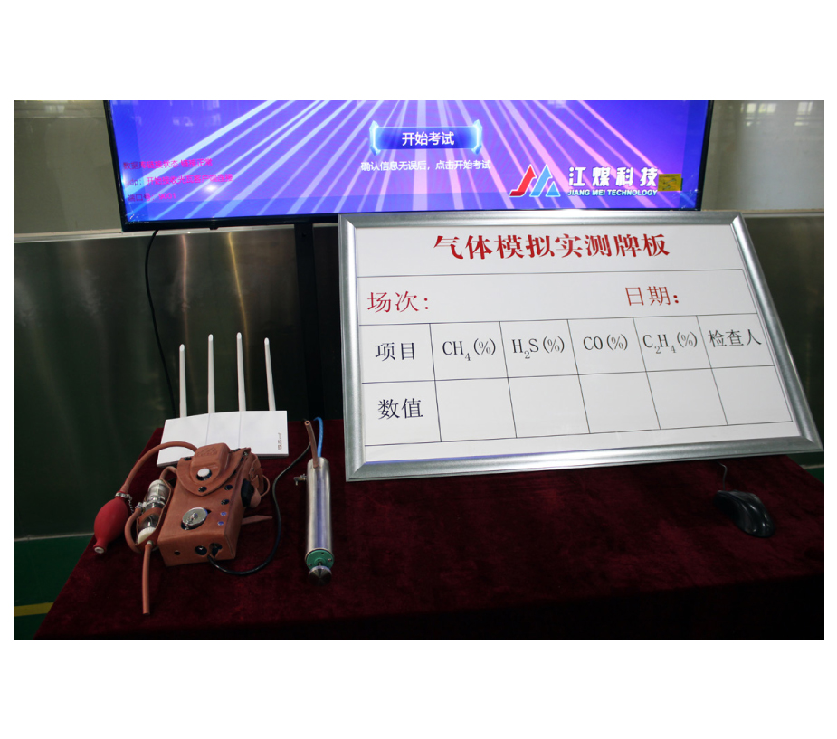 一、概述 该装置是根据2023年全国煤炭行业职业技能竞赛矿山救护工赛项规程中“气体模拟实测”考核项目,研发的JMJHK-D型救护工模拟测气考试装置。 该装置用于矿山救护工在培训、考核过程中,进行气体(甲烷、硫化氢、乙烯及一氧化碳)模拟实测、培训考核使用。通过真实的操作模拟光学瓦斯检定器和模拟气体采样器,采用配套的高性能智能交互模块,直观人机互动,清晰的读取示值,避免了因外界因素对测量值结果造成的精确度误差。考核培训矿山救护工的规范操作流程,正确使用光学瓦斯检定器和气体采样器进行气体测量,更能够提供让考评员现场评定考试成绩。通过反复循环进行操作训练,提高学员的成绩。使竞赛公平、公正、考核结果客观、考核内容规范。 二、使用简介 1、可通过后台手动或随机设定甲烷浓度、硫化氢、乙烯、一氧化碳浓度; 2、对光学瓦斯检定器进行检查、调零; 3、通过操作模拟光学瓦斯检定器可读取分划板及测微组示值;测出甲烷浓度; 4、对模拟气体采样器进行检查、清理气室; 5、通过操作模拟气体采样器,然后操作软件将比长管插入气体采样器中并操作模拟采样器,根据随机提供的被测硫化氢、乙烯、一氧化碳气体,模拟操作读取相应浓度。 三、培训考核内容 1、对光学瓦斯检定器进行检查、调零;
