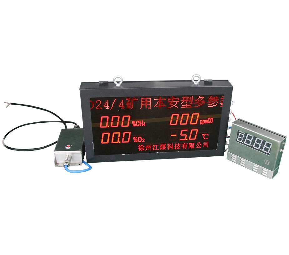 一、概述:该装置用于煤矿井下局部测量参数的显示,便于管理人员能够及时准确、清晰地观察到测量数据。装置有实时和巡检显示方式,不仅能显示井下地址信息和日期时间,还能显示该地点的甲烷、氧气、一氧化碳、温度参数值。 二、基本组成: 该装置主要由PH24型矿用本安型LED显示屏、GD4型矿用多参数传感器、JD4X(D)型悬挂式多参数检测报警仪、KWD127/24型浇封兼本安型电源或配接GJC4X(A)型矿用低浓度甲烷传感器、GTH1000X(A)型矿用一氧化碳传感器、GYH25X(A)型矿用氧气传感器、GWD100X(A)型温度传感器和FYF1.0(A)型遥控发送器组成。 三、主要技术参数:1、额定工作直流电压:24V(电压波动范围:18V~30V); 2、直流电流:小于280mA;3、信号传输性能:a) 传输方式:RS485; b) 传输速率:4800bps; c ) 信号工作电压峰峰值:≤1.2V;4、与关联设备最大传输距离:a) 2km(使用MHYVRP电缆,导体截面不小于1.5mm2; b)分布参数R≤12.8Ω/km、 L≤0.8mH/km、C≤0.06μF/km;5、点阵屏(P4):128*32(显示地址信息); 6、段码屏:2.3寸*18个(显示气体浓度值和温度参数);7、显示屏(长×宽×高):680×380×84mm; 8、光强度:20m处可见;9、最大配接容量:一台显示屏配接一台多参数测定器,或四台单参数传感器; 一台显示屏由两台KWD127/24型浇封兼本安型电源供电,四台单参数传感器共由一台电源供电。