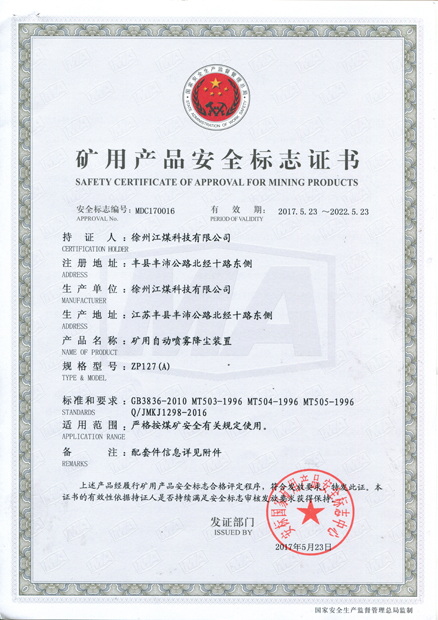 | 序号 | 产品名称/型号 | 煤安证 | 防爆证 | 矿安证 | 3C认证证书 | 计量器具型式批准证 | 专利证书 | 高新技术产品认定证书 | 软件著作权登记证书 |